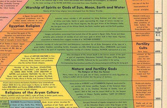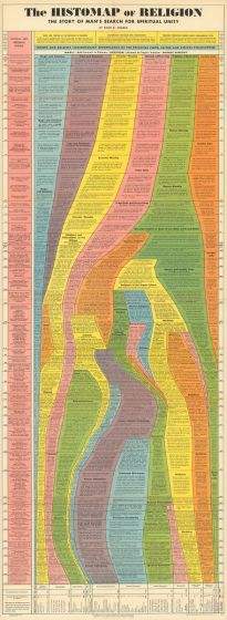 A single page look at how we humans have searched for a spiritual connection! This incredible histomap displays data in a color-coded and linear way, making it easy to see the progression of religious beliefs and philosophies over 100,000 years.