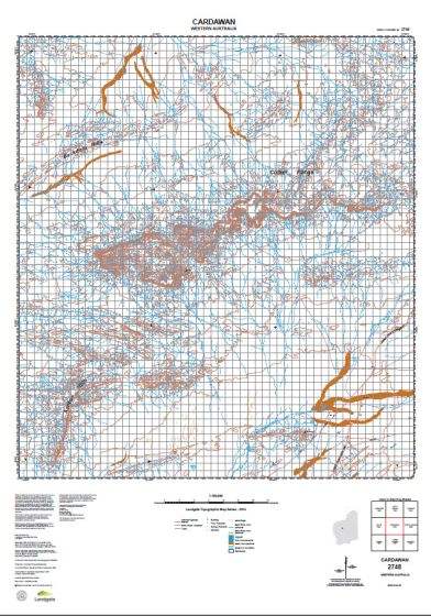 The WA Topo 100 series covers selected state wide areas at 1:100,000 scale where the level of feature density requires 1:100,000 scale mapping. Each sheet covers an approximate area of 30' longitude and 30' latitude which corresponds to approximately 50km by 50km at 20 metre contour intervals.