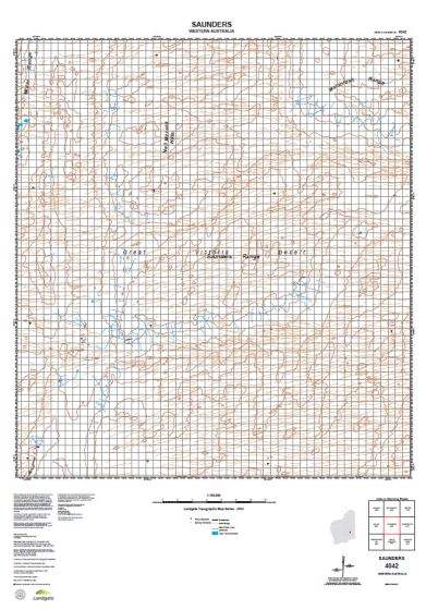 The WA Topo 100 series covers selected state wide areas at 1:100,000 scale where the level of feature density requires 1:100,000 scale mapping. Each sheet covers an approximate area of 30' longitude and 30' latitude which corresponds to approximately 50km by 50km at 20 metre contour intervals.