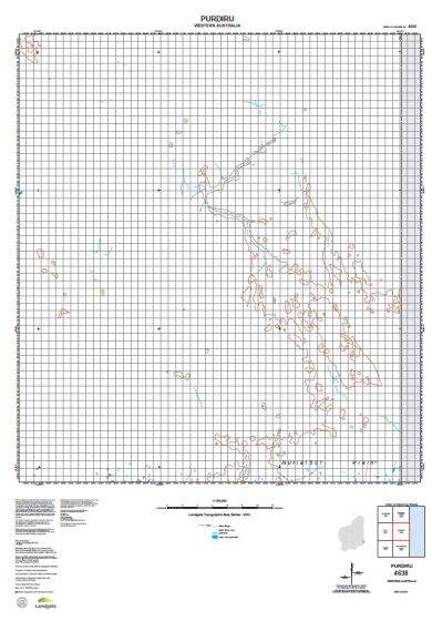 The WA Topo 100 series covers selected state wide areas at 1:100,000 scale where the level of feature density requires 1:100,000 scale mapping. Each sheet covers an approximate area of 30' longitude and 30' latitude which corresponds to approximately 50km by 50km at 20 metre contour intervals.