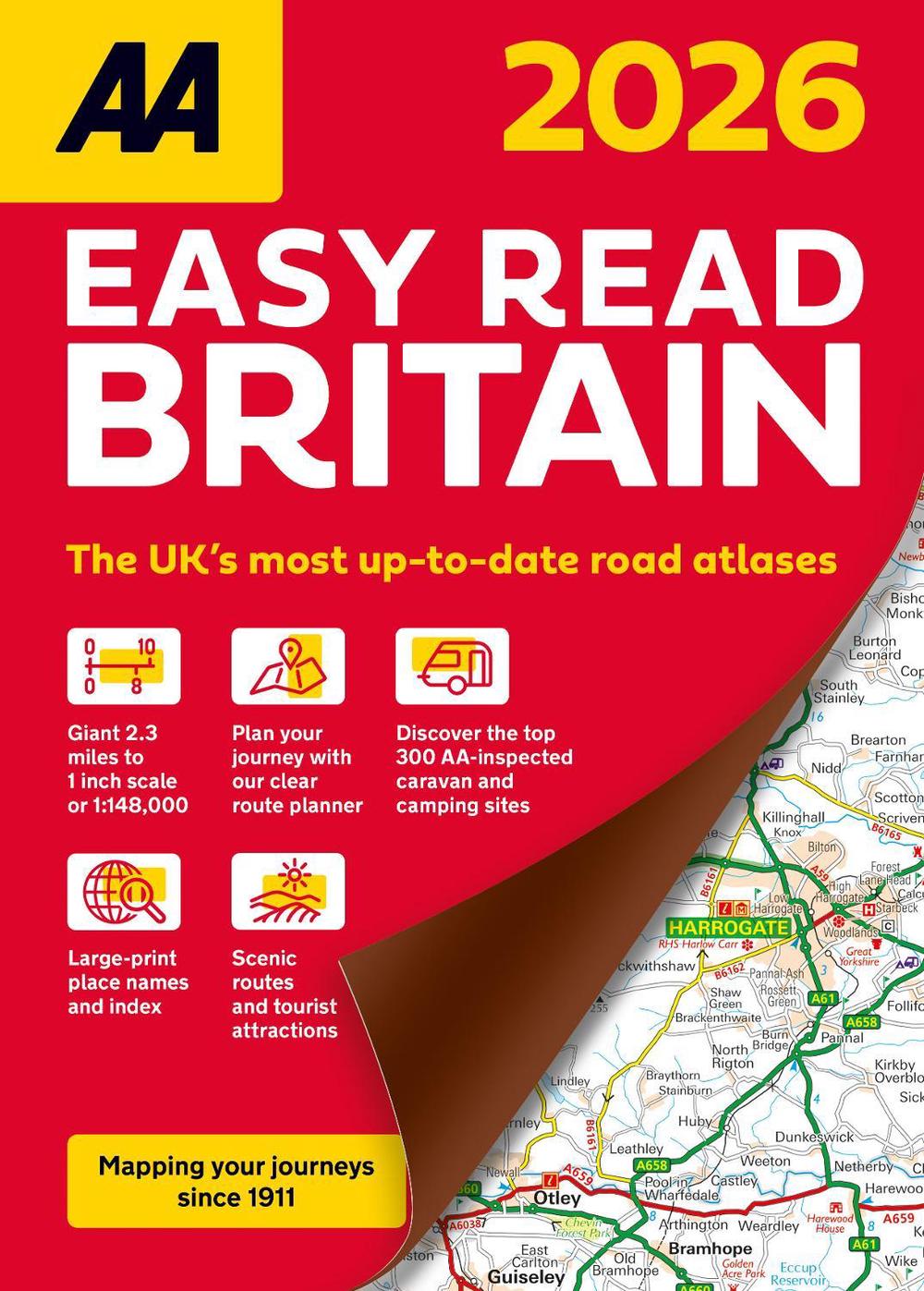 Up-to-date mapping from the experts at the AA. Easy Read Britain Atlas 2026 features include a giant 2.3 miles to 1 inch scale, A4 format revised and updated for 2026, 6 page clear route planner map, top 300 AA-Inspected caravan and camping sites and over 240 service areas.