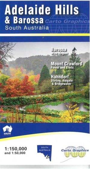 Adelaide Hills & Barossa Map. 1:150,000 scale covering Adelaide Hills region from Strathalbyn to Kapunda, Adelaide to Murray Bridge. Detailed roads and road names, parks, cellar doors, hill shading and more. Clearly displays long distance trails, Heysen Trail, Mawson Trail, Kidman Trail, Lavender Federation Trail etc. Includes 1:50,000 inset blow-up map of the central area, Crafers to Hahndorf.