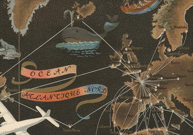 Read MoreThe map is dated 1947 in the lower right below the border. Shows routes east to Japan and west to the Americas. A significant expansion of the airline network from the late 1930's maps by Boucher.