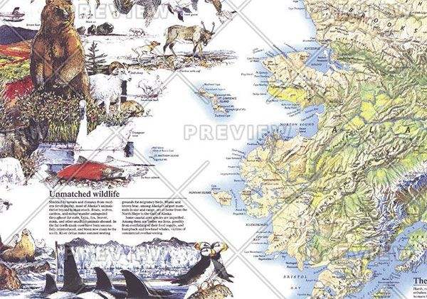 This attractive physical map of Alaska was published in May 1994 to accompany the political map of the state and the article "Alaska's Sky-High Wilderness." Besides its extraordinary geographical details, this map also contains information on federal lands, wildlife and the alaskan natives.