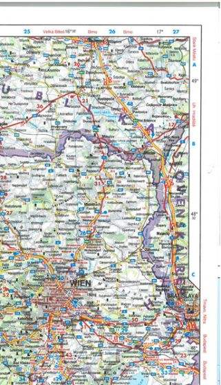 A booklet attached to the cover has an index which also shows postal codes, plus street plans of the centres of Berne, Bolzano, Bratislava, Geneva, Genoa, Graz, Innsbruck, Klagenfurt, Linz, Ljubljana, Lyon, Maribor, Marseille, Milan, Monte Carlo, Munich, Salzburg, Turin, Venice, Vienna, Zagreb, and Zurich.