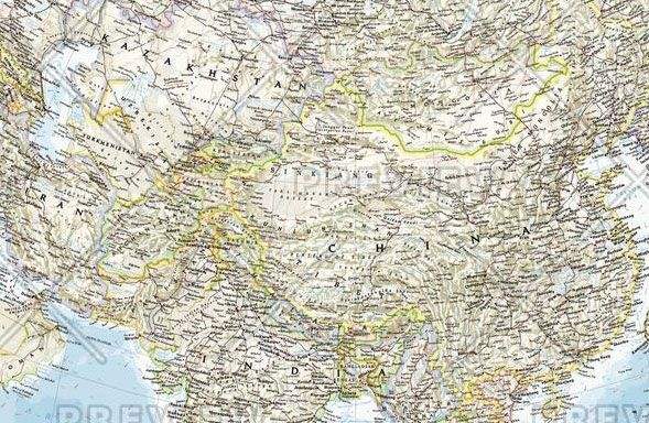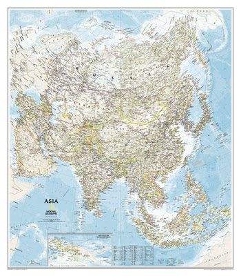 Detailed National Geographic cartography includes country boundaries, place names, bodies of water, and more for the entire Asian continent.