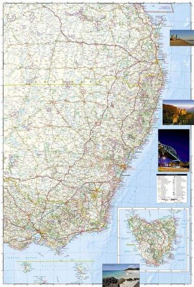 The front side of the Australia East map details Queensland, the Great Barrier Reef, and more. The back side of the map details the southern portion of Queensland, including Brisbane, as well as New South Wales and Victoria. An inset map of Tasmania is also included.