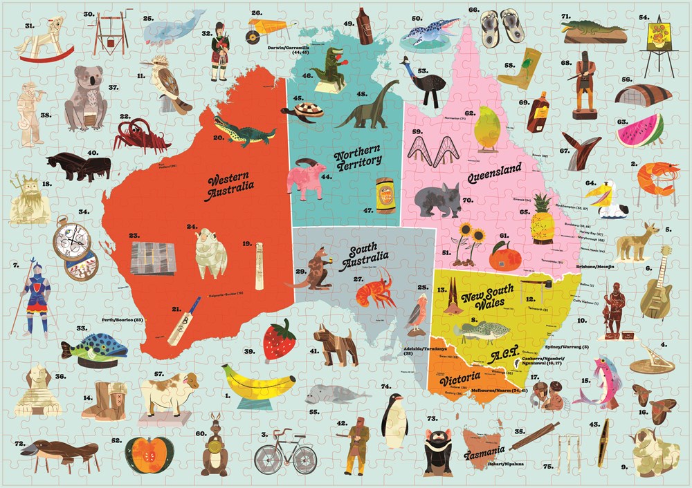 Piece together 75 of the country's favourite oversized novelty icons and landmarks with the Australia's Big Things Map Puzzle.