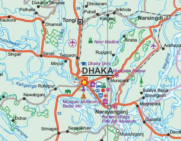 Bangladesh at 1:750,000 on an indexed map from ITM, with street plans of central Dhaka and Chittagong, plus on the reverse a road map of north-eastern India with a street plan of Kolkata plus an enlargement of the city's environs.
