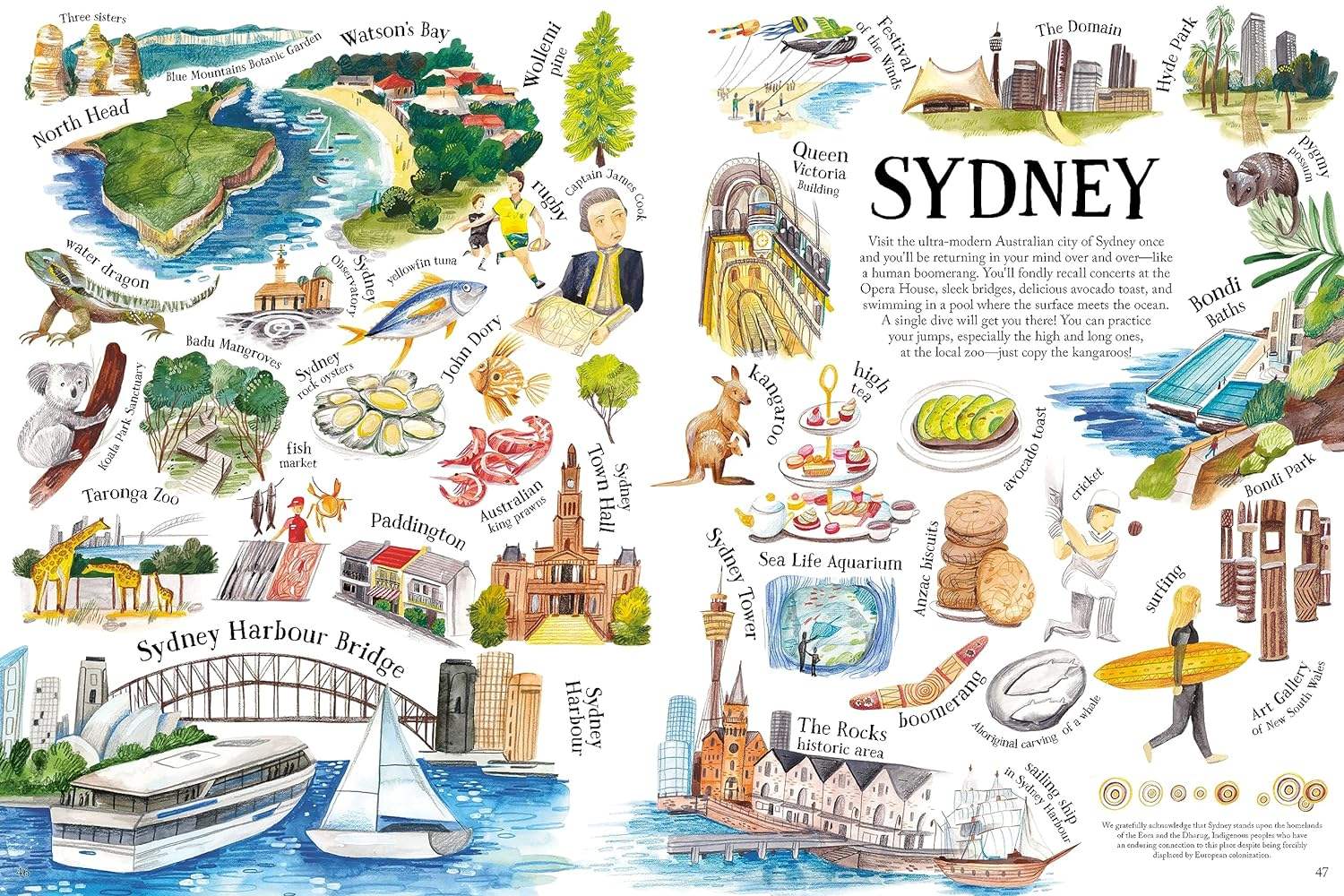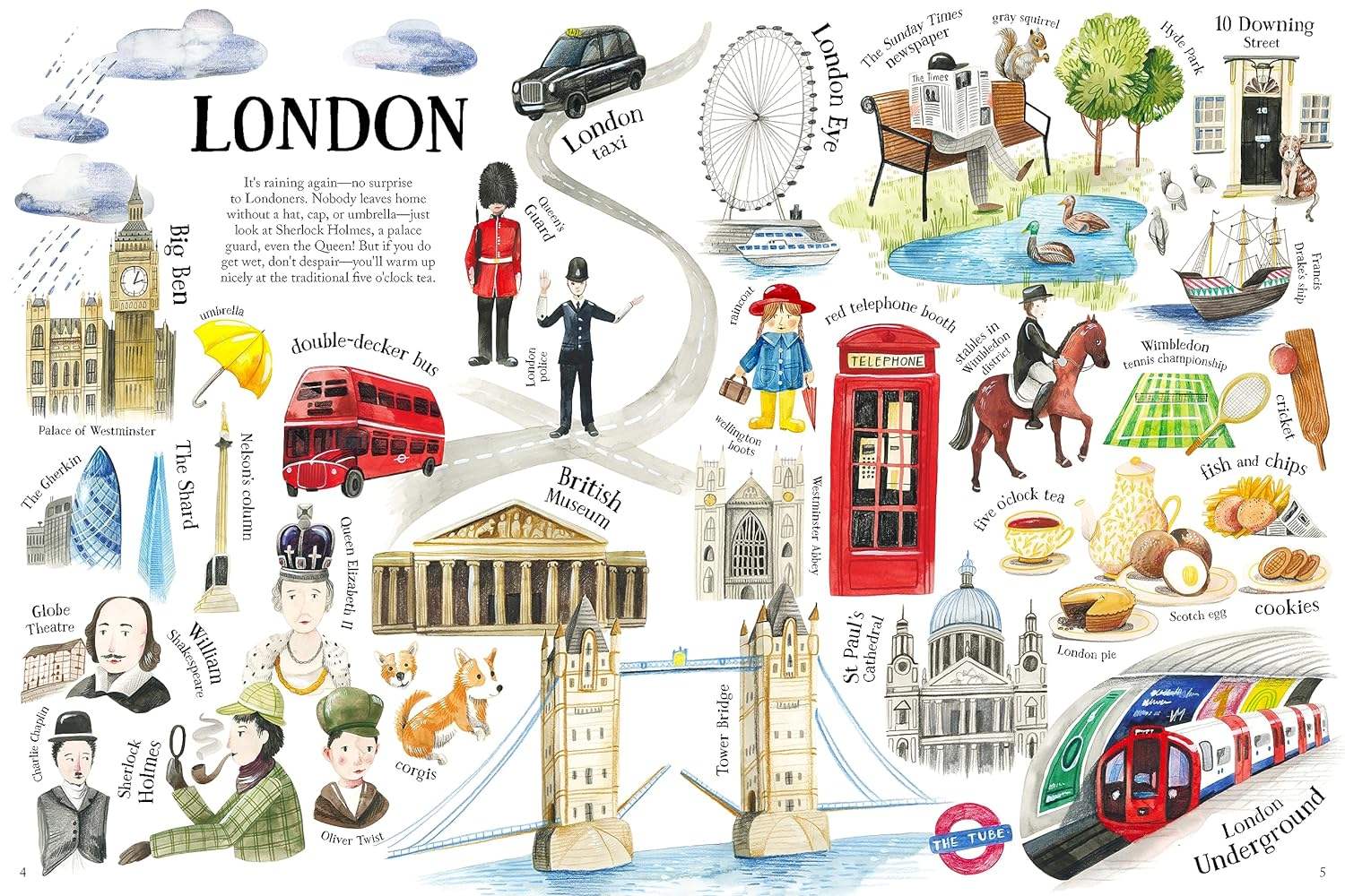 By being immersed in the vibrant illustrations, kids will feel like they're right there in each location, whether they're boarding a red double-decker bus in London or zigzagging through crowds in a tuk-tuk in Cairo. As we stroll along streets steeped in history, we'll admire ancient monuments and marvel at some wonders of modern architecture. And when we're ready for a break, we can taste local delicacies, from croissants in France to sushi in Japan.