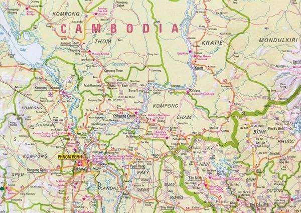 Folded road and tourist map of Cambodia and Angkor at 1:1 500 000 scale. Places of interest, national parks and beaches are all highlighted and shaded-relief colouring clearly depicts the topography.