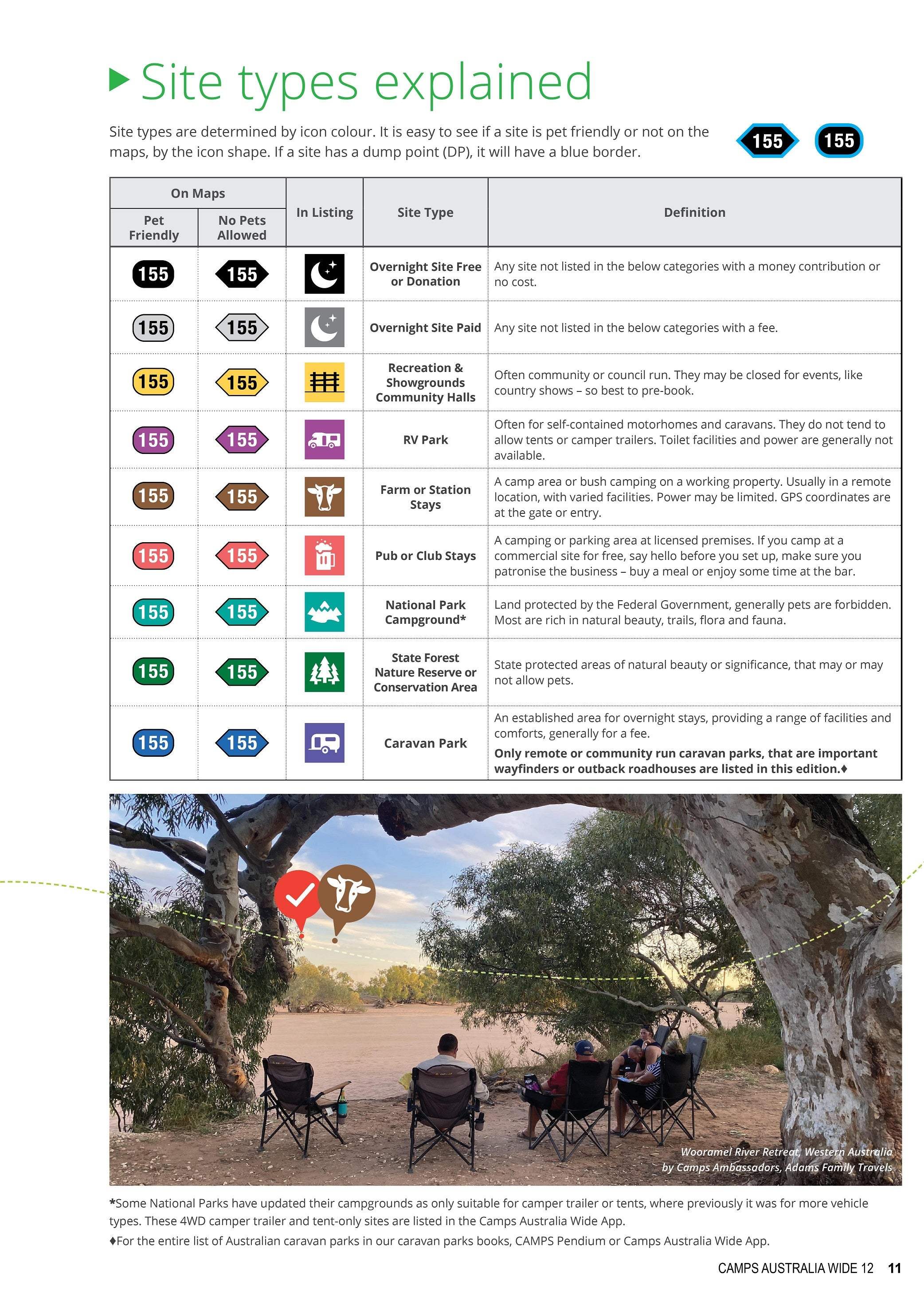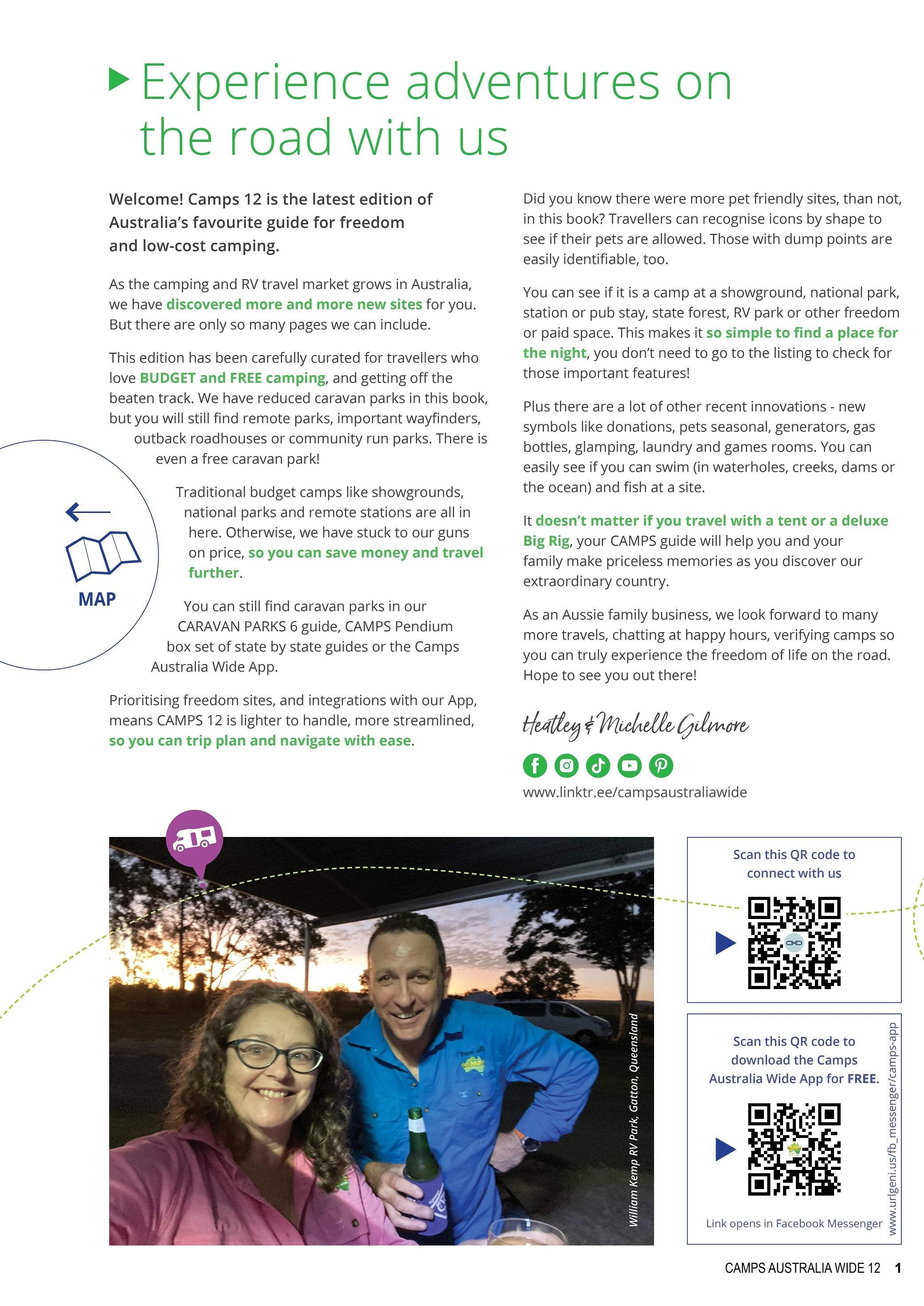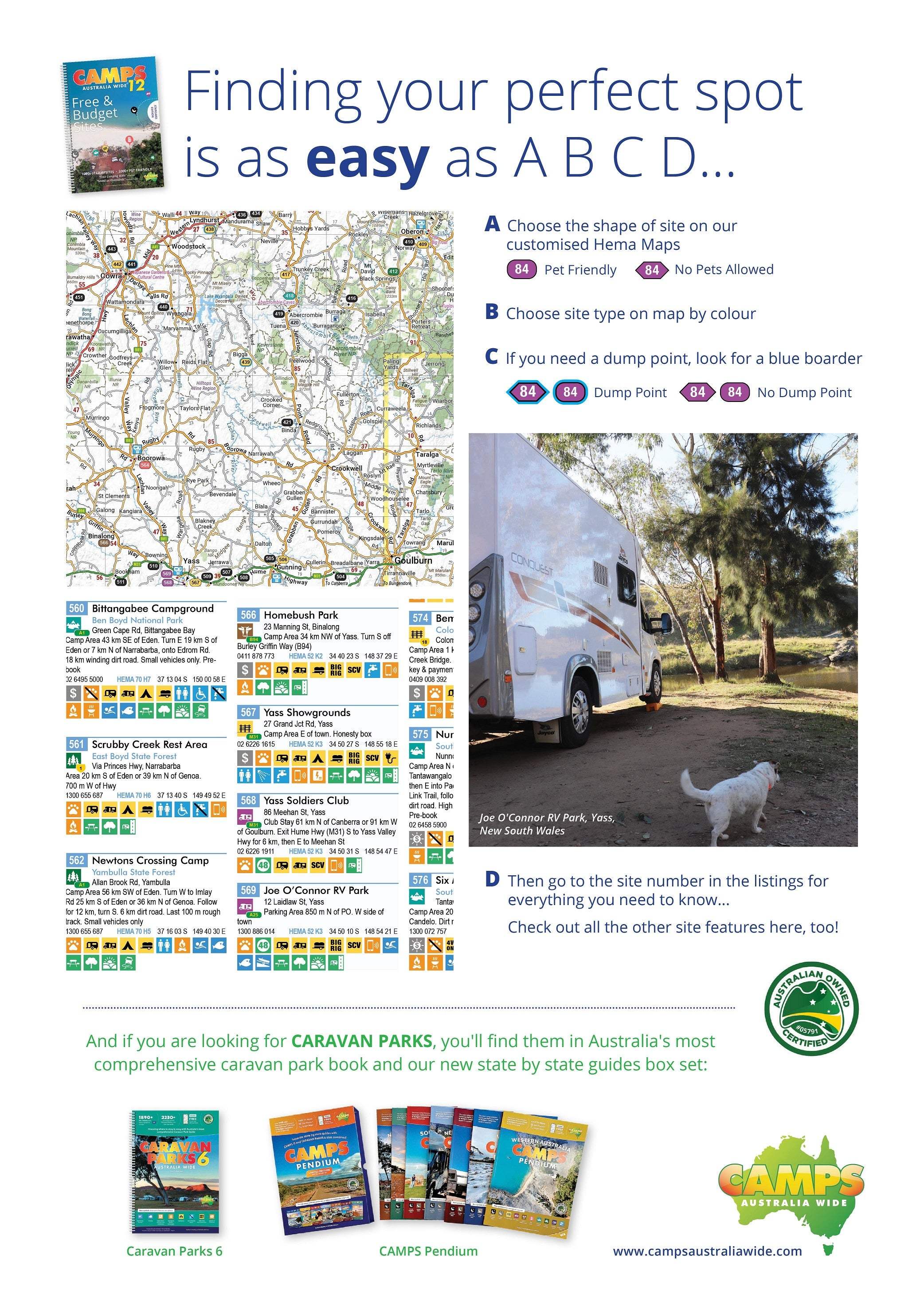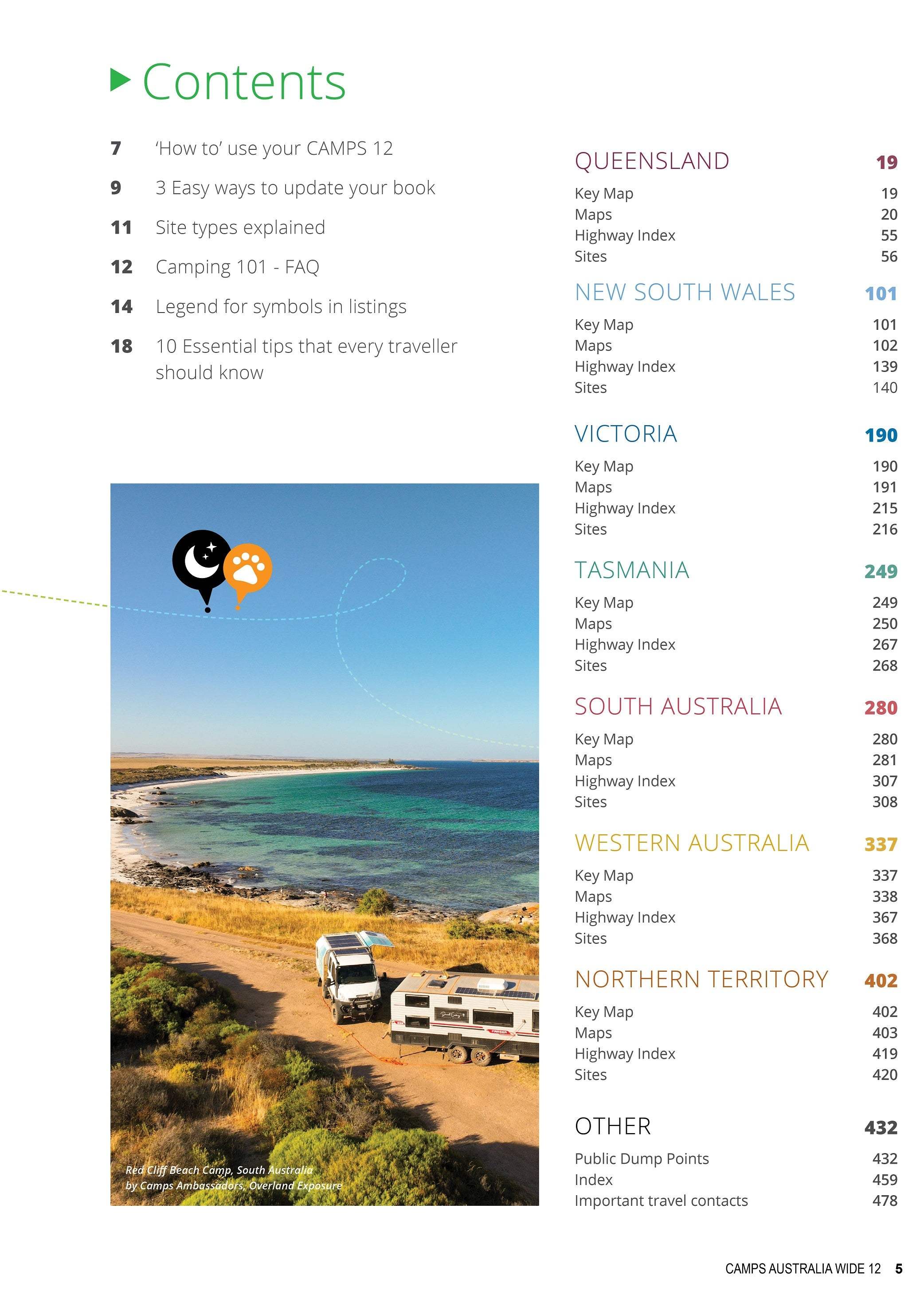 Camps 12 is the only guide you will need for free and low-cost camping across Australia, featuring verified free and budget camps. Travellers can tell if a site is free or paid, national parks, state forests, showgrounds, pub stays, RV parks, station and farm stays on the maps and listings. Only remote caravan parks that are important wayfinders or outback roadhouses are found in this streamlined edition.