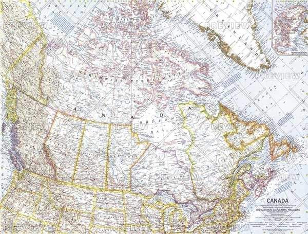 This map of Canada, the "Great White North", is a fine example of the detailed and vibrant cartography for which National Geographic is famous. Of particular note is the boundary marking the northern limit of wooded country. Published in December 1961 with the article "Canada, My Country."