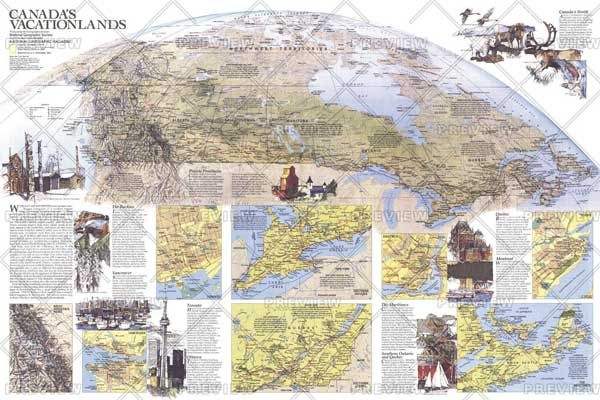 Explore Canada's diverse vacationlands with this educational map printed in November 1985 to supplement the political and physical map of the country and the article "Kluane: Canada's Icy Wilderness Park." From world-class wilderness to spirited cities, Canada has something for every vacationer.