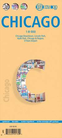 This map covers Chicago Downtown (1:8 000), Lincoln Park (1:16 000), Hyde Park (1:20 000), Chicago & Region (1:250 000), O'Hare Airport (1: 22 500), Public Transportation CTA, Top 30 Sights and USA administrative & time zones.