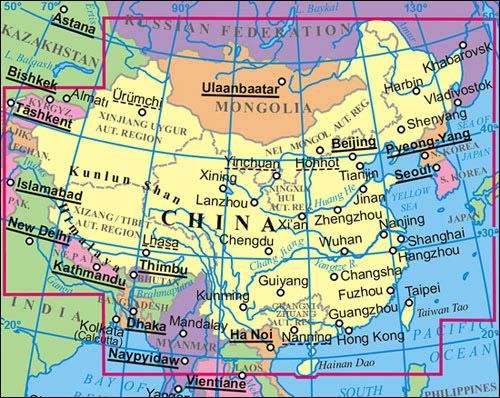 The map shows the country's topography by bright altitude colouring plus graphics to show swamps, deserts, etc, and names of various mountain ranges, peaks, etc. All place names are shown transliterated into Latin alphabet, but with names of larger towns also given in Chinese.