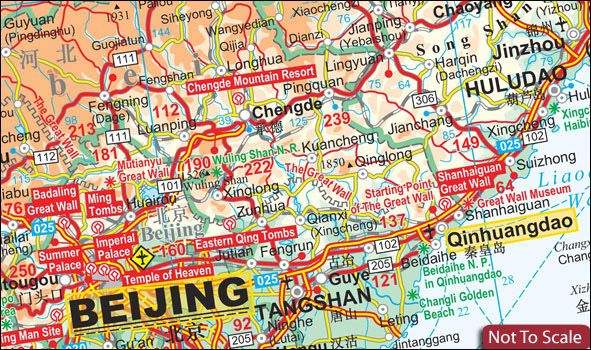 The map shows the course of the Great Wall of China, prominently highlights UNESCO World Heritage sites, and indicates other places of interest. Latitude and longitude lines are drawn at 3