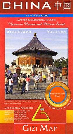 China at 1:4,750,000 on an indexed map from Gizi Maps, showing its topography by bright altitude coloring, road and rail networks, etc. Administrative boundaries are marked and also presented on a separate inset.
