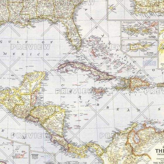 Read MorePublished in October 1947, this map of the Countries of the Caribbean features Mexico, Central America, and the West Indies as well the islands of the Caribbean. Inset maps of ten of the most prominent islands and the Panama Canal zone provide detail of the region. The article "Guatemala Revisited" accompanied the map.