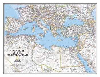 This National Geographic wall map features the countries bordering the "great inland sea"- the Mediterranean. Exquisitely detailed, this reference map contains hundreds of place-names, many shown with their commonly recognized conventional (English) names.