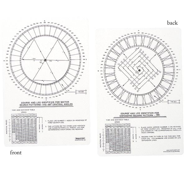 The Course & Leg Identifier is a marine plotter used for expanding square patterns and sector pattern searches. Also known as a Search Pattern Slide Rule or Coast Guard Plotter, this plotter is a "must have" for active duty U.S. Coast Guard, Auxiliarists, or anyone who needs to run a search pattern. The Course & Leg Identifier quickly calculates both heading and run time for each leg of the search ...