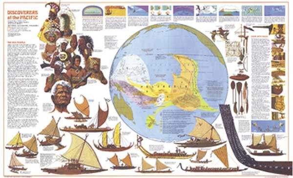 The Discoverers of the Pacific map was published in December 1974 as half of a two-map set with the Islands of the Pacific map and the article "The Coming of the Polynesians." An educational work, this map contains an abundance of information about Pacific Islanders, their shipbuilding techniques, types of canoes, and how they navigated using the stars, birds, and other natural data.
