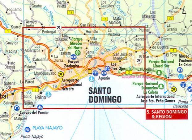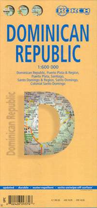This soft-laminated map of the Dominican Republic in the 17th edition includes: Dominican Republic 1:600 000, Puerto Plata & Region 1:250 000, Puerto Plata 1:20 000, Santiago 1:17 500, Santo Domingo & Region 1:250 000, Santo Domingo 1:22 500, Colonial Santo Domingo 1:10 000, Punta Cana & Region 1:185 000, and Dominican Republic administrative.