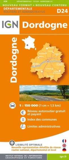 From IGN's series covering each of the French adminstrative departments at 1:200 000 comes this Dordogne map. The map number D24 reflects the official French department number and is the first two digits of all the postcodes within that department.