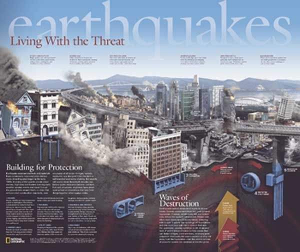 Published in April 2006 as half of a two-piece set with "Danger Zones: Earthquake Risk, A Global View," this remarkable poster demonstrates the damage done to buildings, highways, high-rises, and other structures within a city when plates shift. It also reveals how strict construction standards and new innovations help hold things together when earthquakes strike.