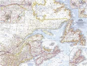 Explore the multitude of harbors, bays, inlets, and rivers to be found in Newfoundland, Labrador, Quebec, and the Maritime provinces with this compelling map of Eastern Canada. Includes wonderful detail of the region with inset maps of the provincial capitals, as well as maps of Cape Breton Island and the St. Lawrence Seaway. Published in May 1967, makes a fine companion to the maps of Central Canada (1963) and Western ...