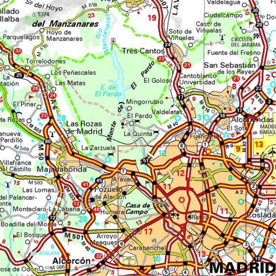 Part of the orange regional series from Michelin, this Extremadura, Castilla La Mancha, Madrid map shows this part of Spain in excellent detail. Primary & secondary road networks are clearly marked out with indications of the number of lanes, intermediate distances and various possible road obstacles or things you should know including steep hills, height limits, toll barriers, prohibited roads and roads subject to restrictions.