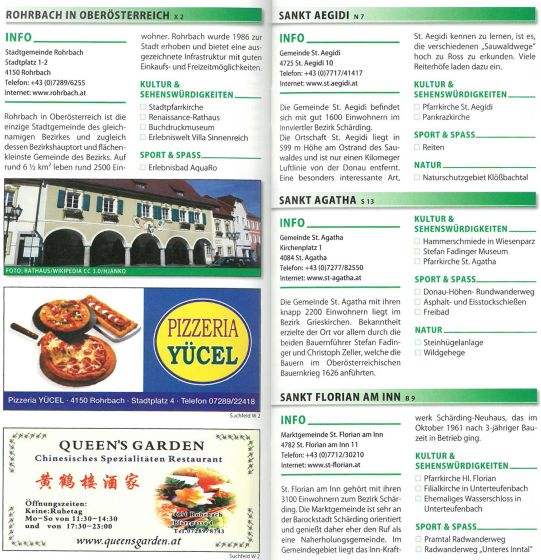 The enclosed information booklet contains a selection of the best hiking trails, biking trails and mountain bike trails as well as a short description of the individual communities with their leisure activities. (Language: German)