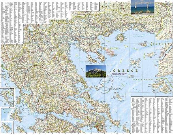 The front side of the Greece map shows the northern region of the country with Macedonia and Bulgaria to the north, Albania to the west and Turkey to the east. There are insets detailing the islands of Kerkyra and Zakynthos. The reverse side of the map details the southern portion of Greece showing the islands down to Crete.