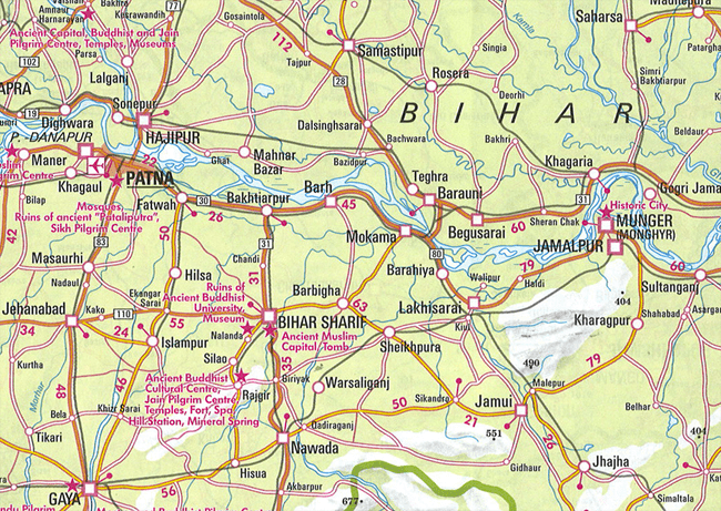 One of five maps in a series covering India at 1:1 500 000 scale. Folded road and tourist map of eastern India, including Nepal and southern Tibet to the north, Calcutta to the east, Visakhapatnam to the south, and Kanpur and Jabalpur on the western edge of map. Points of interest, national parks and railways are all highlighted and shaded-relief colouring clearly depicts the topography.
