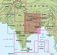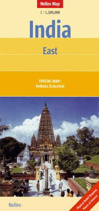 The map includes insets showing regional Kolkata (Calcutta) at 1:300 000 and a locator map. The legend is in English, French and German. The other titles in the series are India North, India North East, India South, and India West. Nelles also produces a map of the whole Indian Subcontinent at a scale of 1:4 500 000.