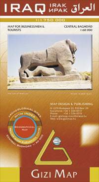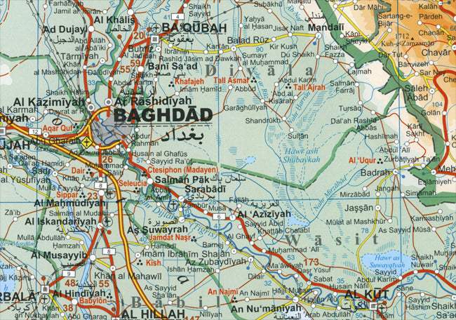 A colourful geographical map of Iraq at a scale of 1:1 750 000, with elevation tinting and spot heights to show topography. Road detail is good including many minor tracks, intermediate road distances are also shown in kilometres on the bigger roads.