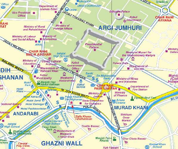 On one side is a street plan of Kabul at 1:16,500 extending well beyond the central part of the city to include the international airport. The map indicates locations of various governmental and ...