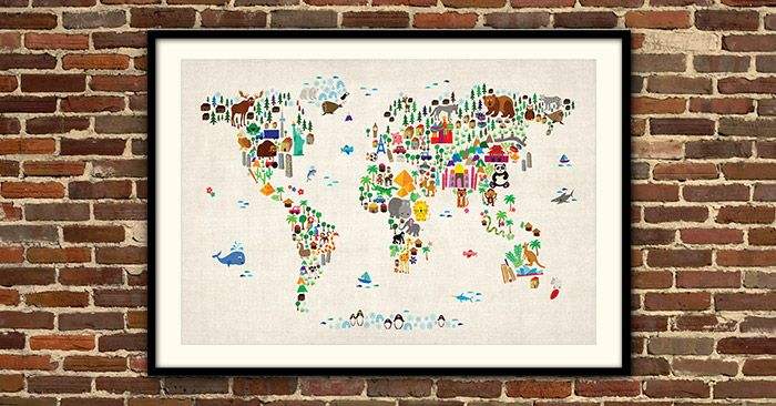 Colourful and vibrant map of the world made from animals. Look closely and you will see the animals are shown in their home continents. Can you spot the African Lion or the Chinese Panda?