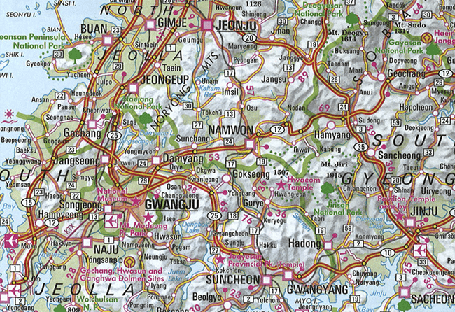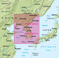 Folded road and tourist map of both North and South Korea at 1:1 500 000 scale. Places of interest, national parks, beaches, and ferry routes are all highlighted and shaded-relief colouring clearly depicts the topography.