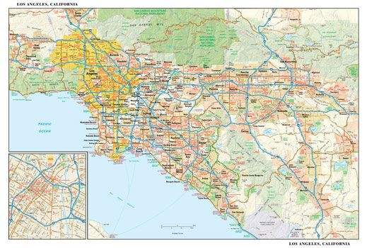 The map is beautifully rendered with terrain relief. The inset map of central Los Angeles shows highways, streets, parks, landmarks, and other points of interest. Chinatown, Little Tokyo, the Arts District, South Park, and the Financial District are among the neighborhoods shown on this map.