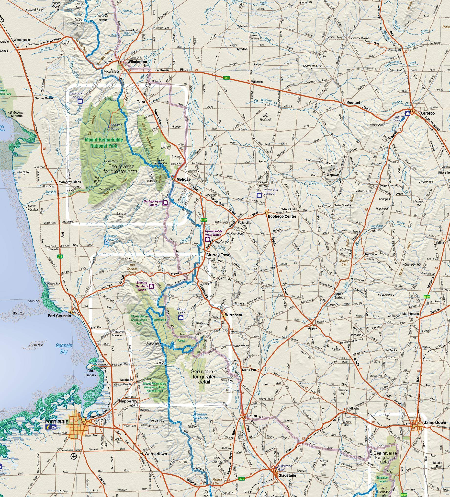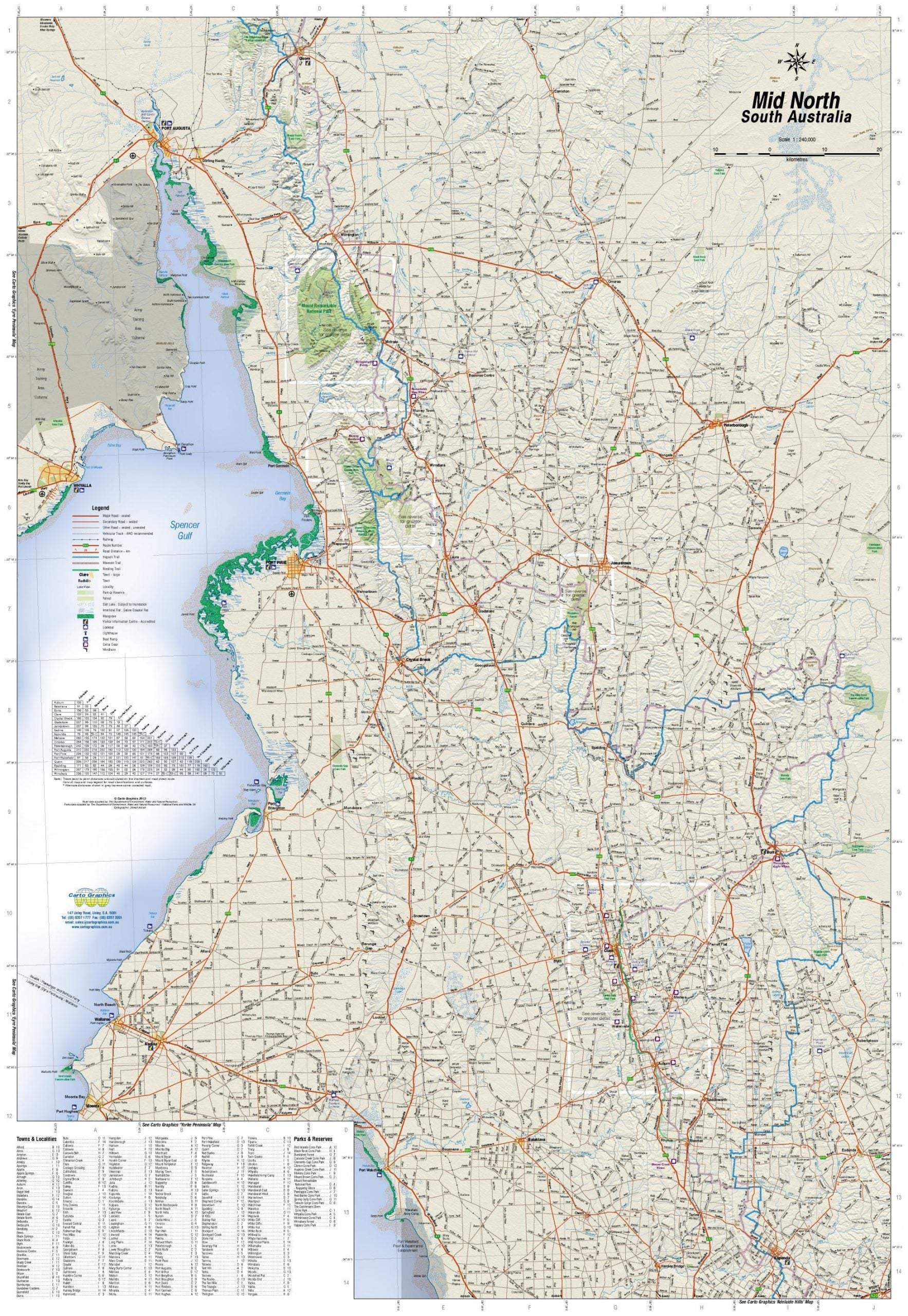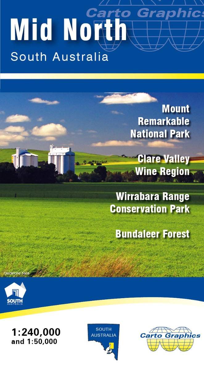 Mid North South Australia Map – Carto Graphics 1:240,000 touring map of the Mid North region of South Australia covering the region from Kapunda in the south to Quorn in the north. The northern Mount Lofty Ranges and Southern Flinders Ranges. Full country road detail with long distance Heysen and Mawson trails, conservation and national parks.