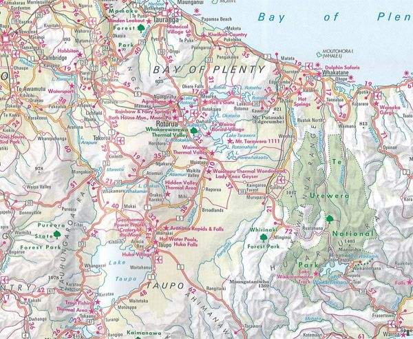 Folded road and tourist map of New Zealand at 1:1 250 000 scale. Places of interest, national parks, and recreation areas are all highlighted and shaded-relief colouring clearly depicts the topography.