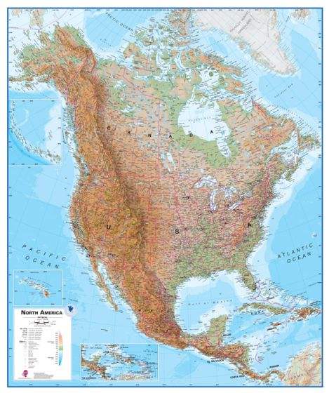 Maps International's North America physical wall map covers a huge expanse of land from Alaska and Canada through the United States down to Mexico, Central America and the Caribbean. One of the finest maps money can buy!