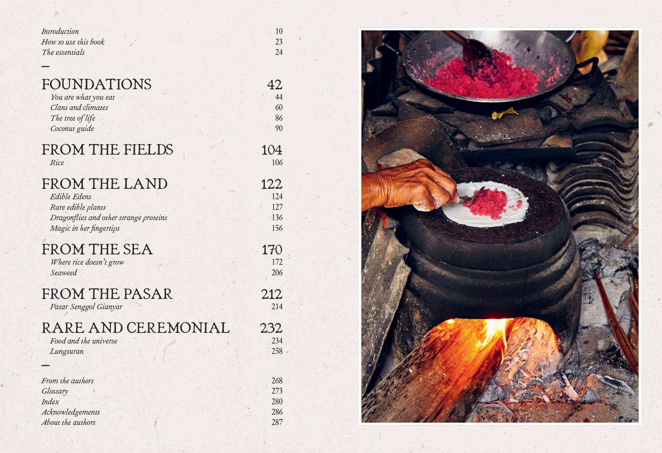Journey through rice fields, food forests, coastal towns and bustling markets in six chapters: Foundations; From the Fields; From the Land; From the Sea; From the Pasar; and Rare and Ceremonial.