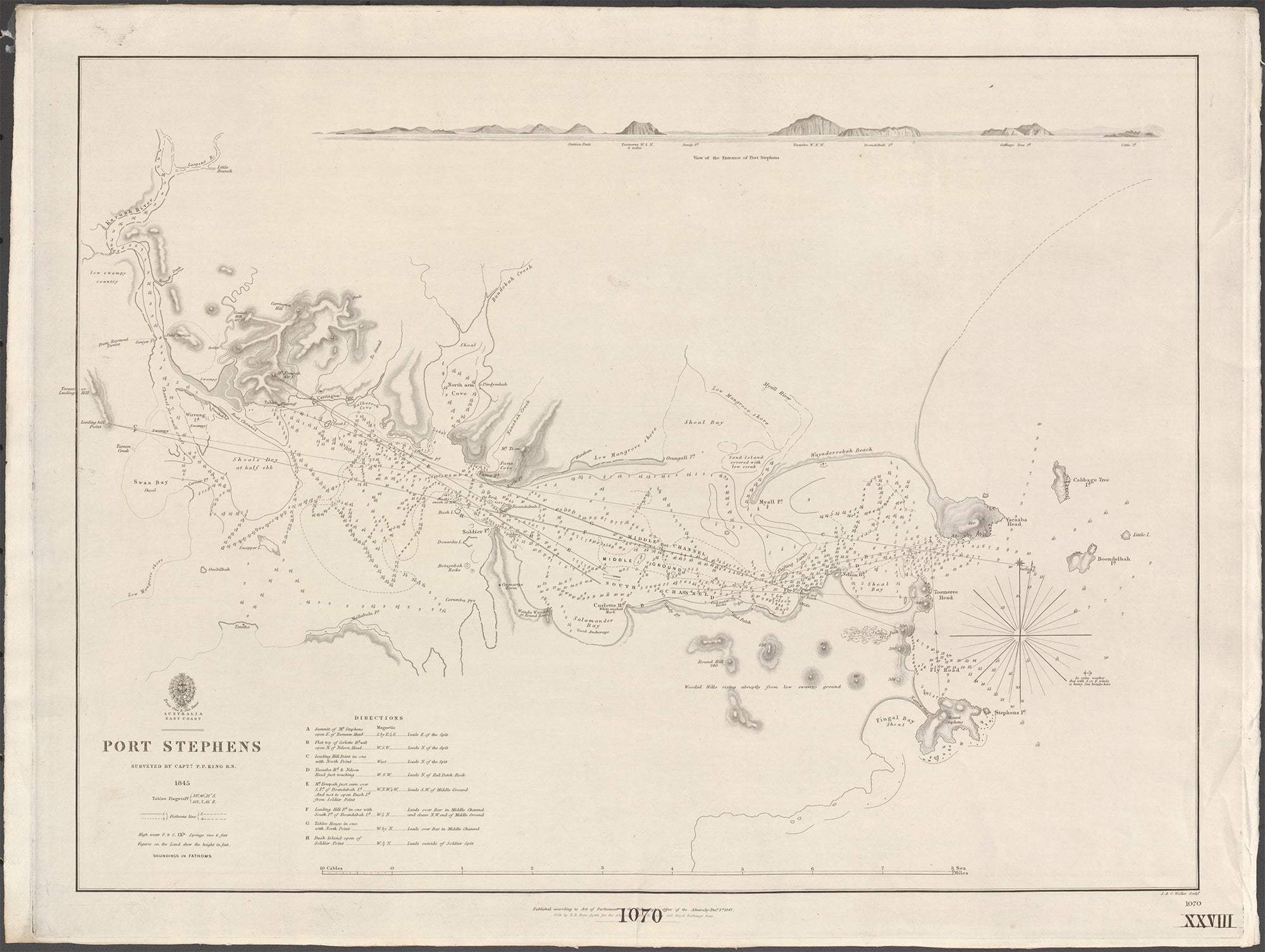 A beautiful reproduction of an 1847 Port Stephens chart from the British Admiralty.