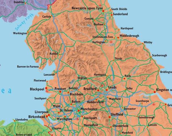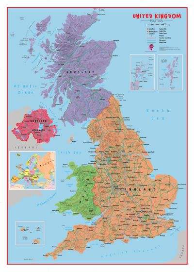 Politically coloured UK wall map specifically designed for primary school aged children in mind. UK wall map is divided according to country boundaries and each shown in a different colour. Cities and towns are shown on the wall map aimed at primary children, as are the major roads and motorways of the UK.