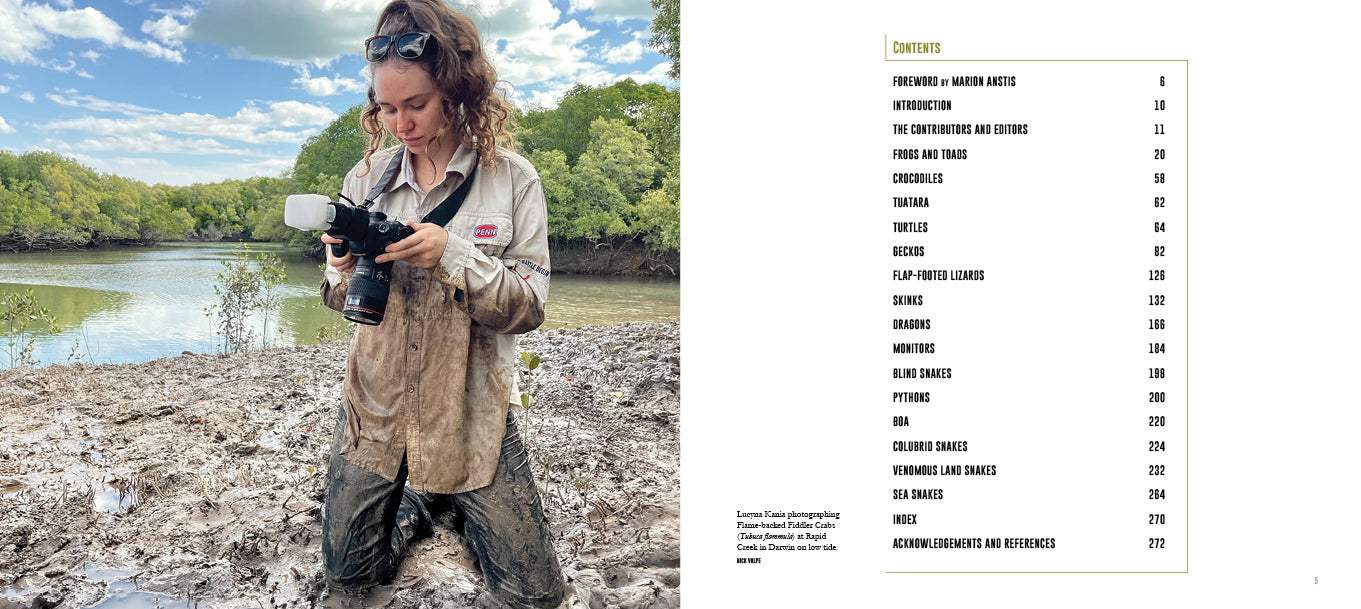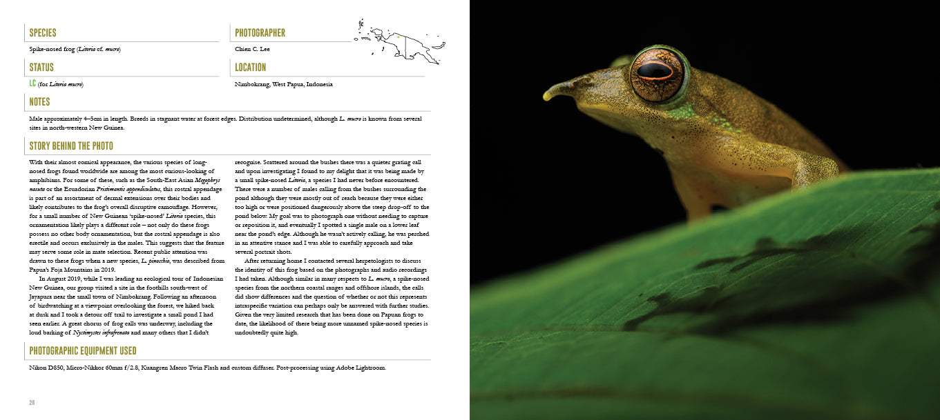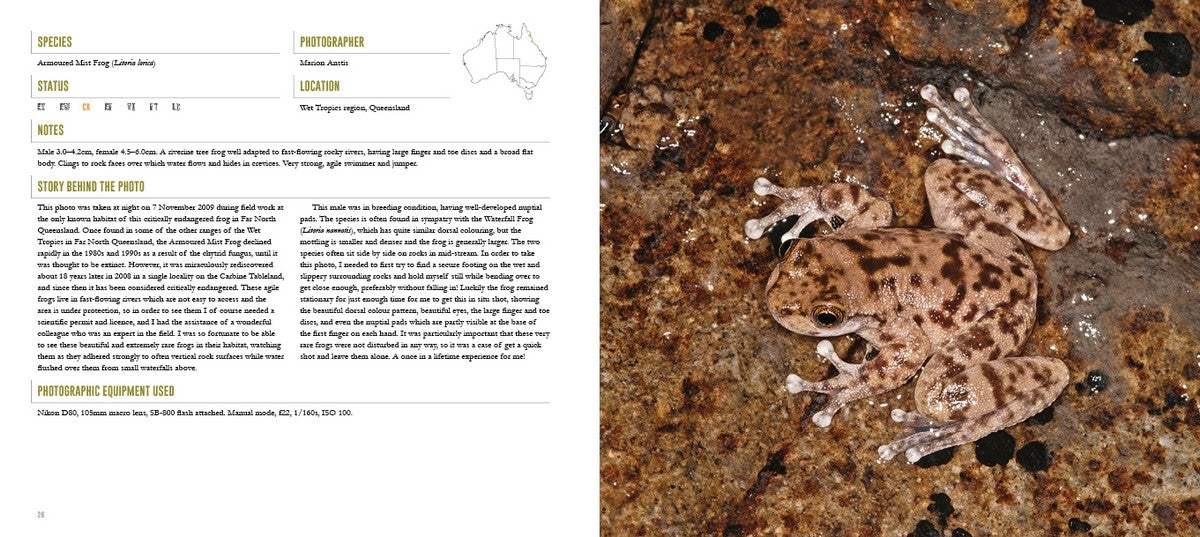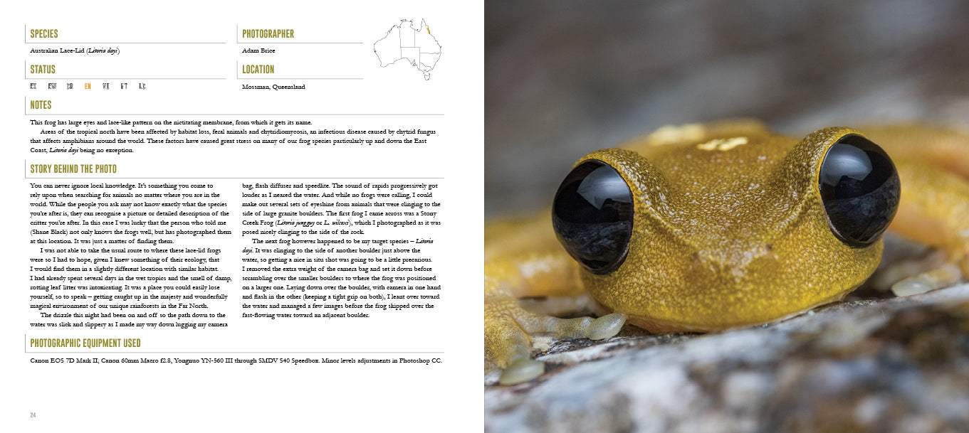Reading like a large field guide with jaw-dropping images, this publication includes details on each species’ natural history and distribution. The often rare and spectacular subjects include Horned Land Frog, Jewelled Gecko, Red-eyed Crocodile Skink, Emerald Monitor and Green Python. For each photo technical specifications are highlighted while the story behind each image takes you alongside the photographer for each shot.