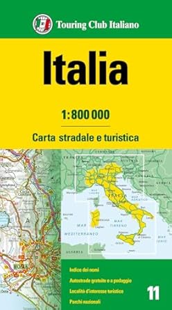 Map of Italy published by the Touring Club Italiano. This map is double-sided and also provides excellent coverage of neighboring regions (to the west it extends as far as Grenoble and Toulon; to the north it covers all of Switzerland, the German Alps, Tyrol, and southern Austria as far as Salzburg; to the east the whole of Slovenia, further north of Croatia, including Zagreb and the Adriatic coast as far as Split).