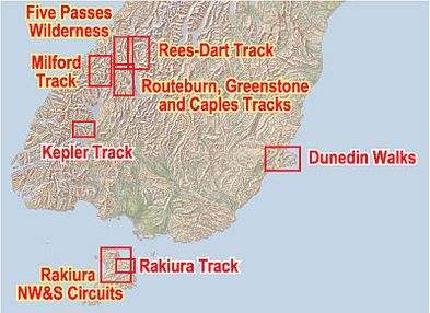 These popular tracks are in a dramatic landscape. The map portrays the full length of both tracks, as well as the Caples Track which lies between them. The tracks lie within the Fiordland National Park. The few road access points are shown.