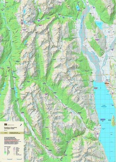 The fully-detailed topographic background, which does justice to the environment, has been created by a combination of contours and relief shading. This map overlaps the Five Passes Wilderness map to the north and the Rees-Dart Track map to the north east.